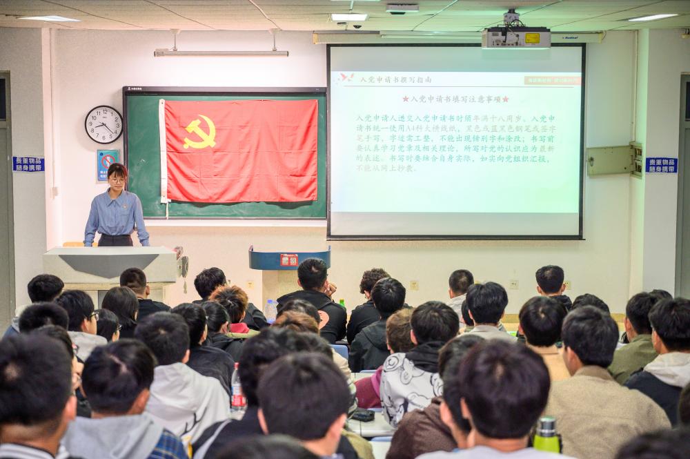左丹同志从基本要求、内容要点、格式规范三个方面为大家详细讲解如何撰写入党申请书。她重点指出,对党的认识需基于最新党章与党的最新理论;入党申请书的内容需结合个人思想实际,体现真实性与思想进步性;个人思想汇报要涵盖政治信念、成长经历、学习工作等内容;此外,她还向新生推荐了求是网、“学习强国”平台等学习资源,助力新生深入学习党的知识,为新生撰写入党申请书做好准备。