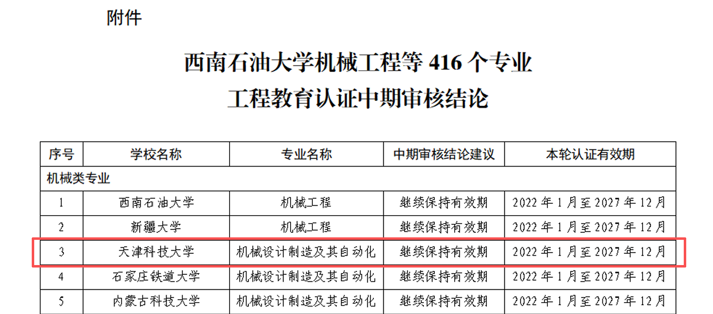 近日,中国工程教育认证协会发布公告,我院机械设计制造及其自动化专业依次完成了专业类认证委员会文件审核、在线核实及多级结论审议等评审环节,顺利通过工程教育认证中期审核。