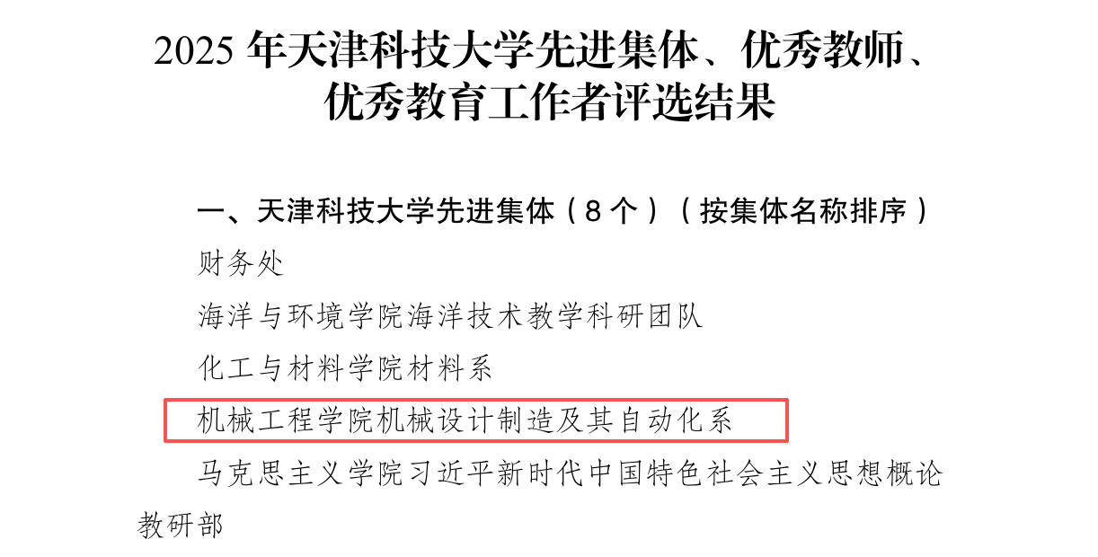 同年前期,机械工程学院机械设计制造及其自动化系获评“2025年天津科技大学先进集体”,并在教学建设评选工作中,机械设计制造及其自动化新工科专业教学团队(负责人李文辉)获批新一轮“天津科技大学教学团队”。