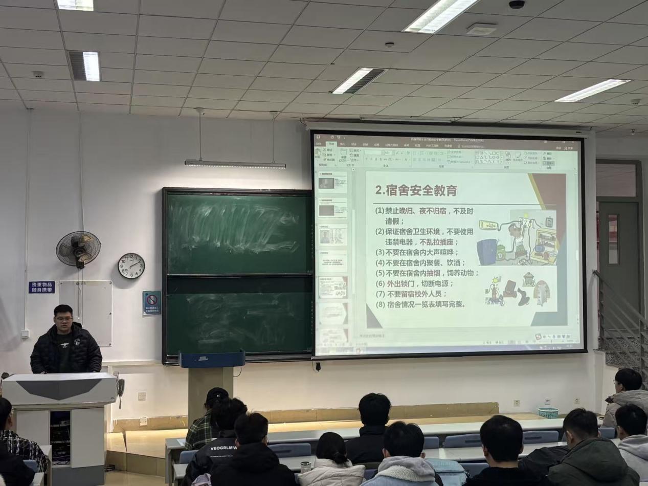 随后,梁嘉钧老师对本学期整体学生工作进行了总结回顾,并重点对下一阶段的就业推进、研究生应征入伍、校园安全管理工作进行了强化部署。针对科研安全,梁老师明确要求全体研究生必须严格遵守实验室操作规程,将安全意识融入日常研究的每一个环节。在宿舍安全方面,他强调同学们需自觉遵守管理规定,杜绝安全隐患。梁老师进一步指出,学生党员和班委应切实承担起示范引领责任,带头落实各项安全要求,共同守护平安校园。