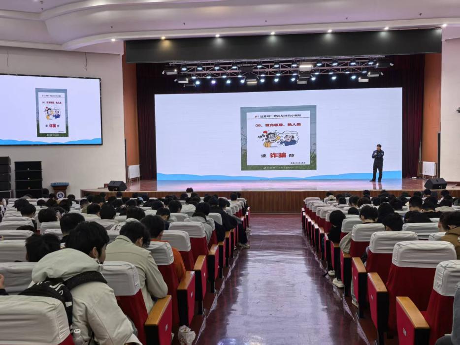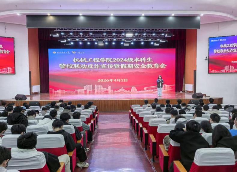 为进一步提升学生反诈防骗意识,筑牢校园安全防护网,2026年4月2日中午,机械工程学院于滨海校区千人礼堂召开2024级本科生警校联动反诈宣传暨假期安全会,全体2024级本科生到场参会。